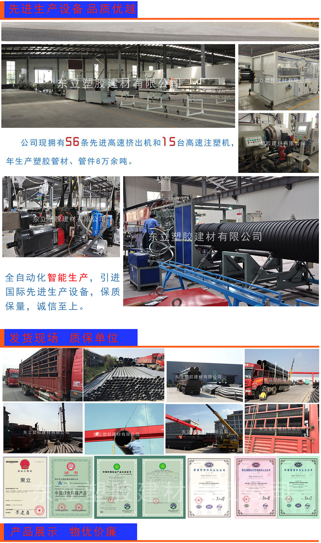 ??主要生產“東立”品牌塑膠管道,主要產品包括五大系列十六種產品,規(guī)格齊全,產能龐大、供貨及時,設備先進、質量穩(wěn)定,服務優(yōu)良、滿足客戶的需求。
